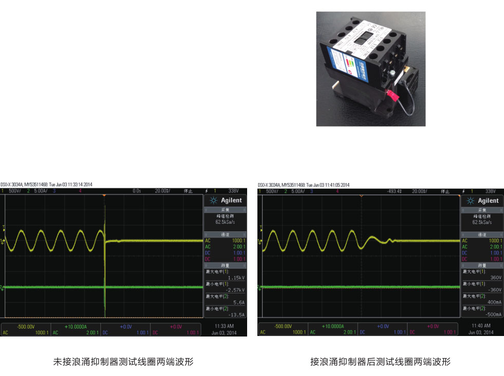 (2)当交流接触器线圈分别并接我公司设计生产的浪涌抑制器时,在线圈断电瞬间产生的浪涌电压得到了有效的抑制。